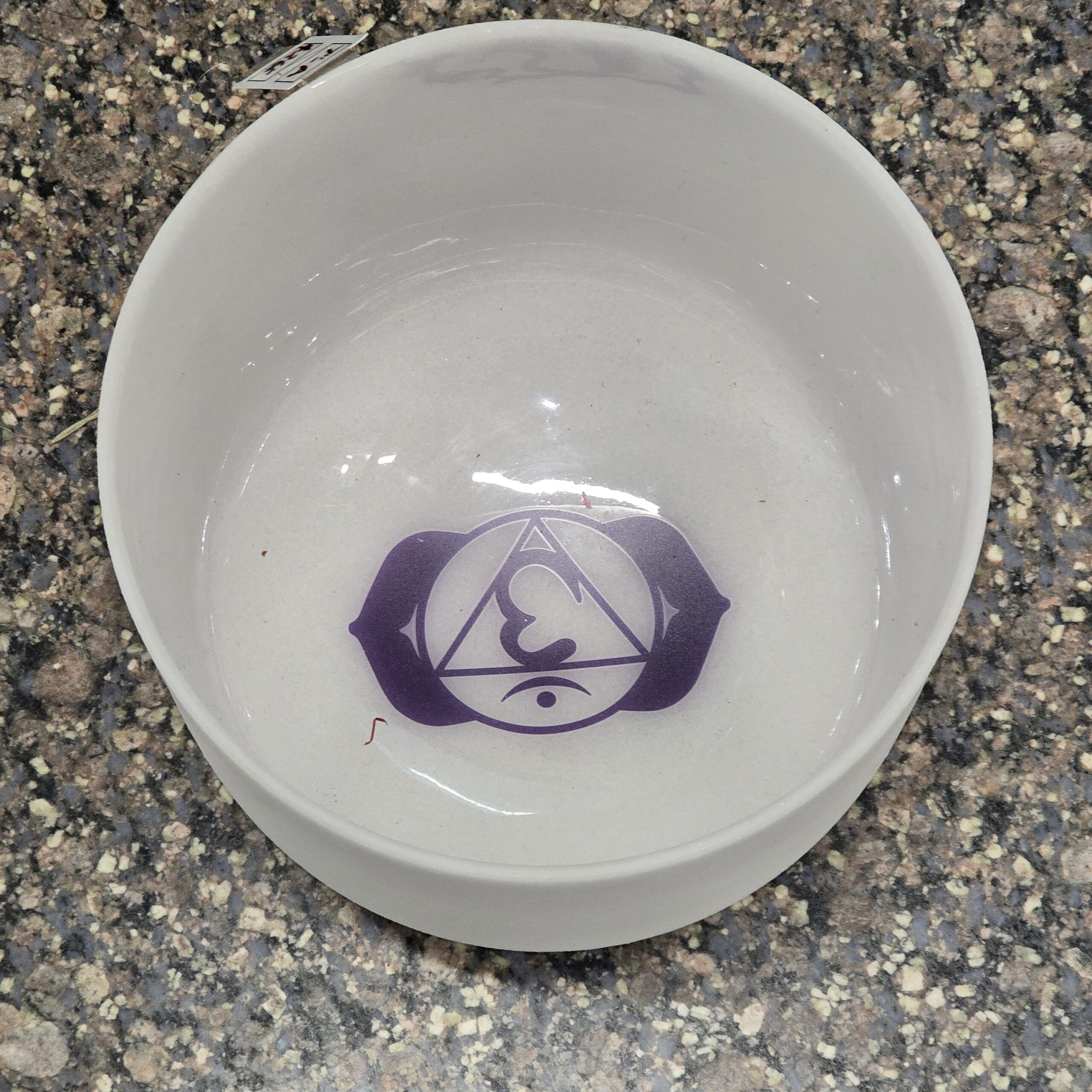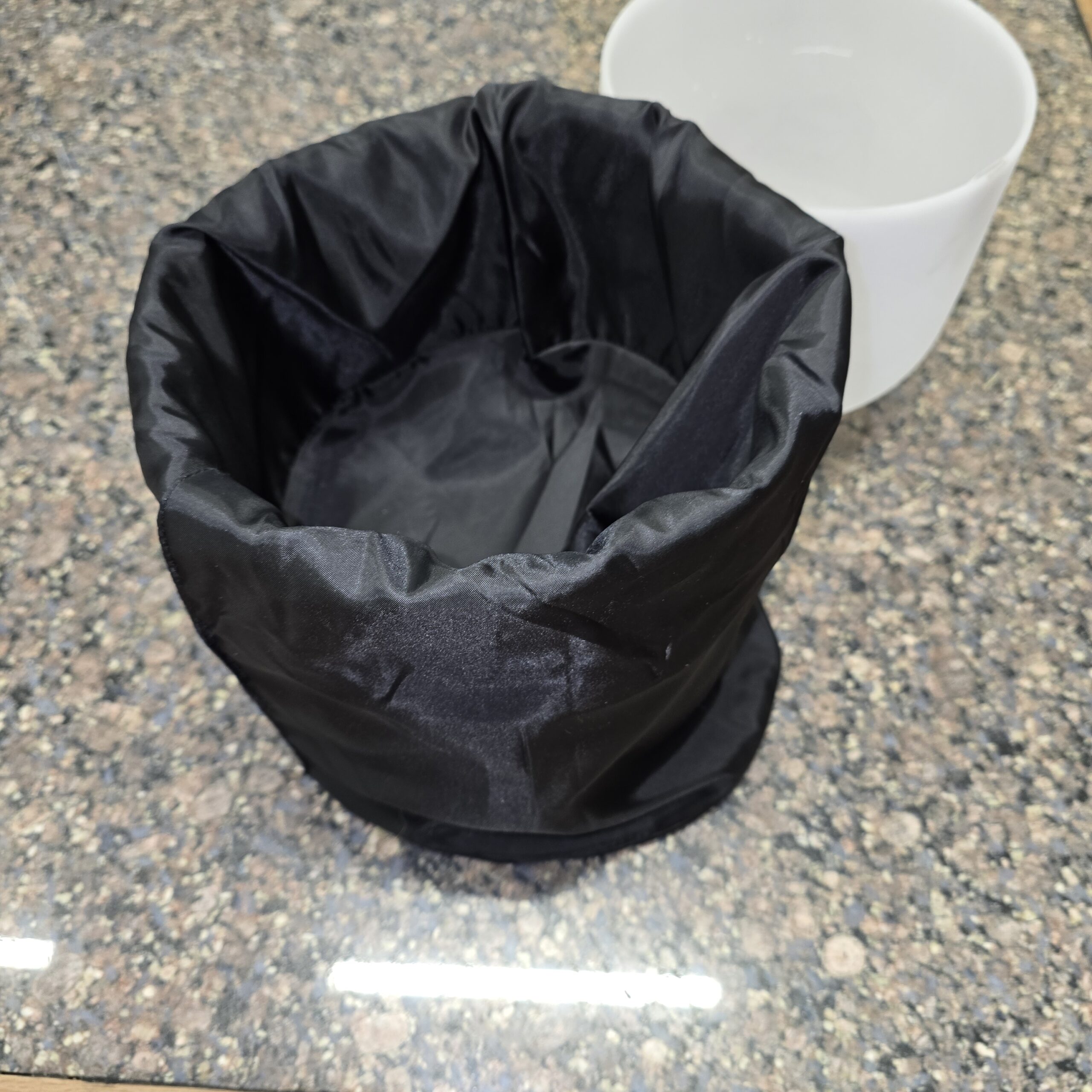 This 7″ bowl resonates to the note of “A”. It comes with a leather rubbing stick, a rubber o-ring on which to sit it and a black foam topless cover in which to carry it.